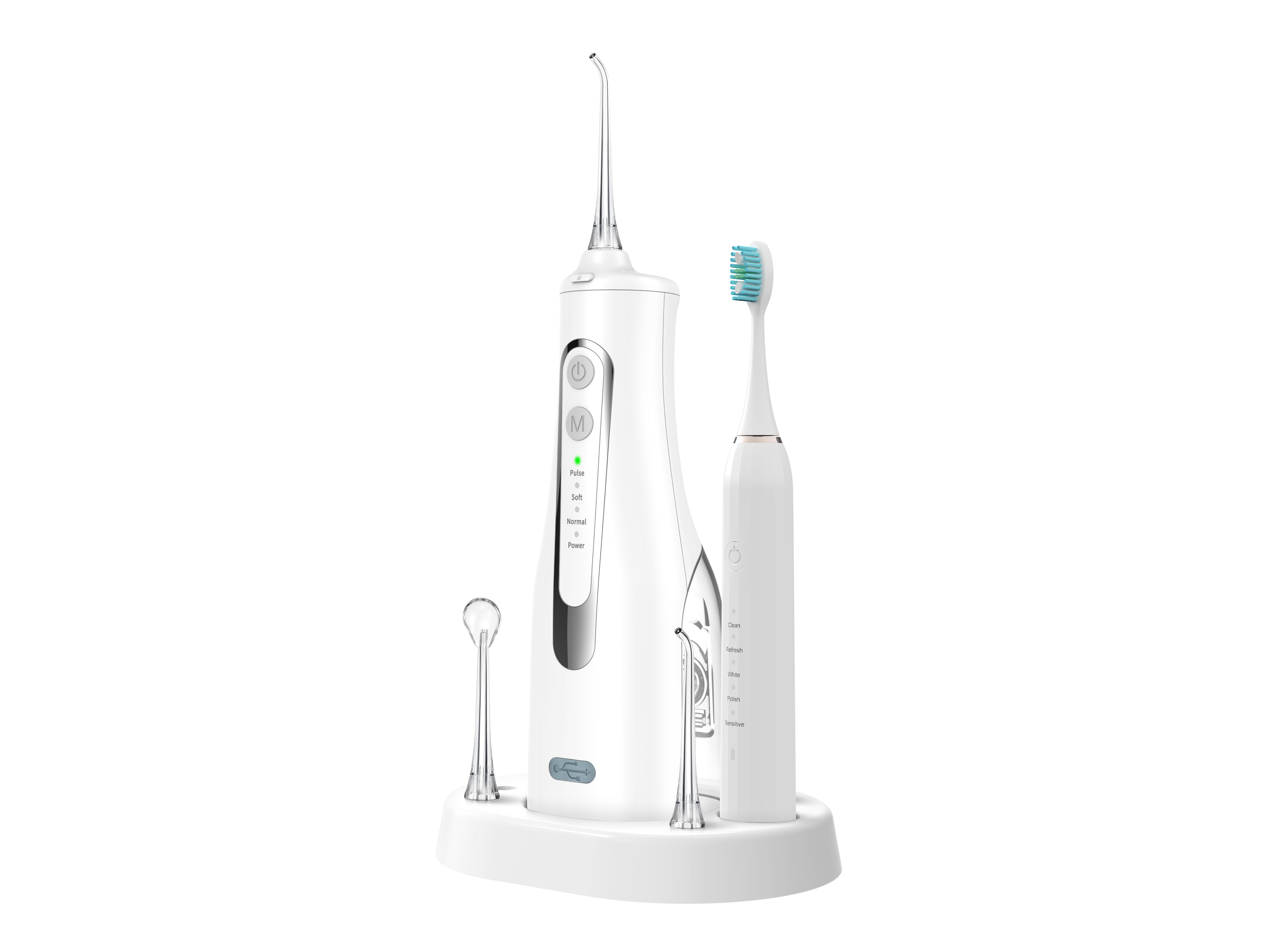 Water flosser and electric toothbrush combo delivering premium quality at an affordable price. Featuring a sleek modern finish, leak-proof design, and ergonomic grip. It's ideal for sensitive teeth and braces.