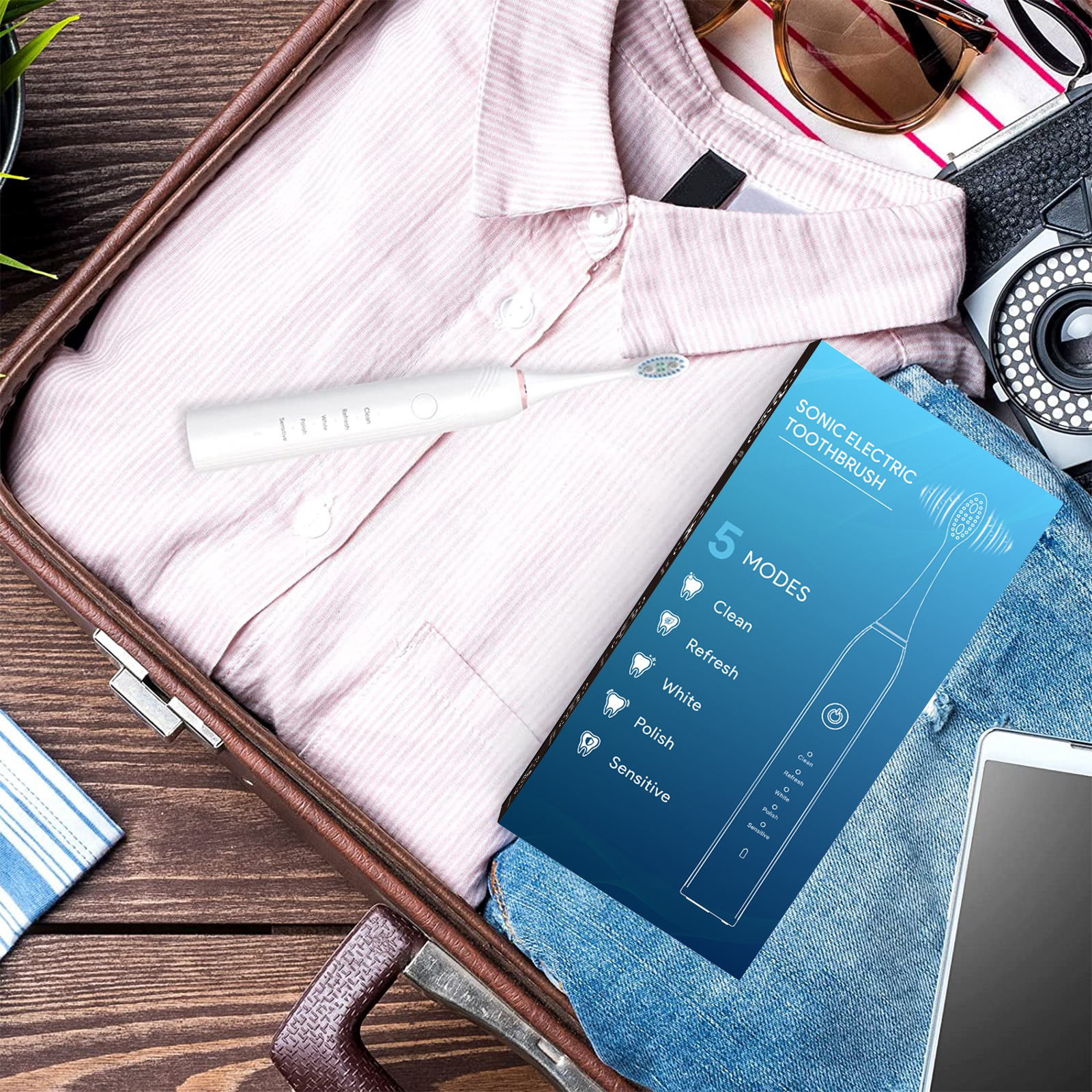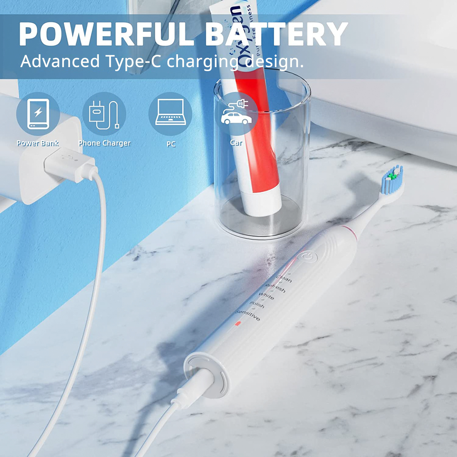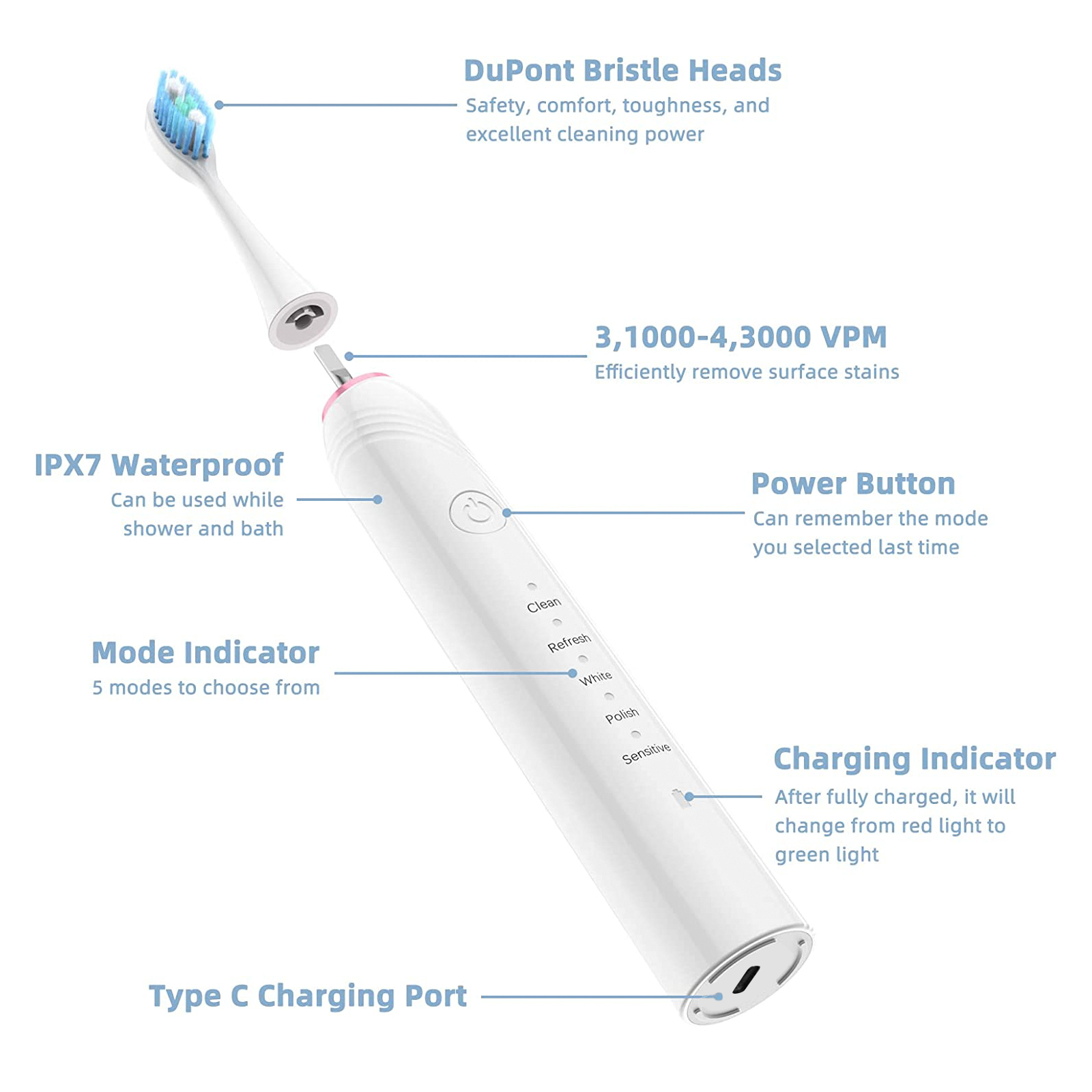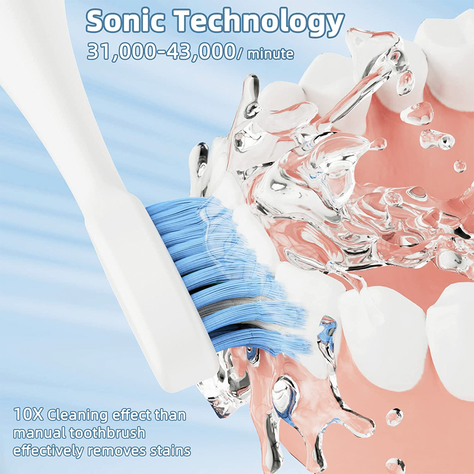 Звуковая электрическая зубная щетка имеет высокое качество, которое может обеспечить длительный срок службы. Мягкая головка щетки, гладкий и прочный корпус зубной щетки могут обеспечить вам лучший опыт использования. Умный таймер поощряет вас формировать хорошую привычку чистки зубов.