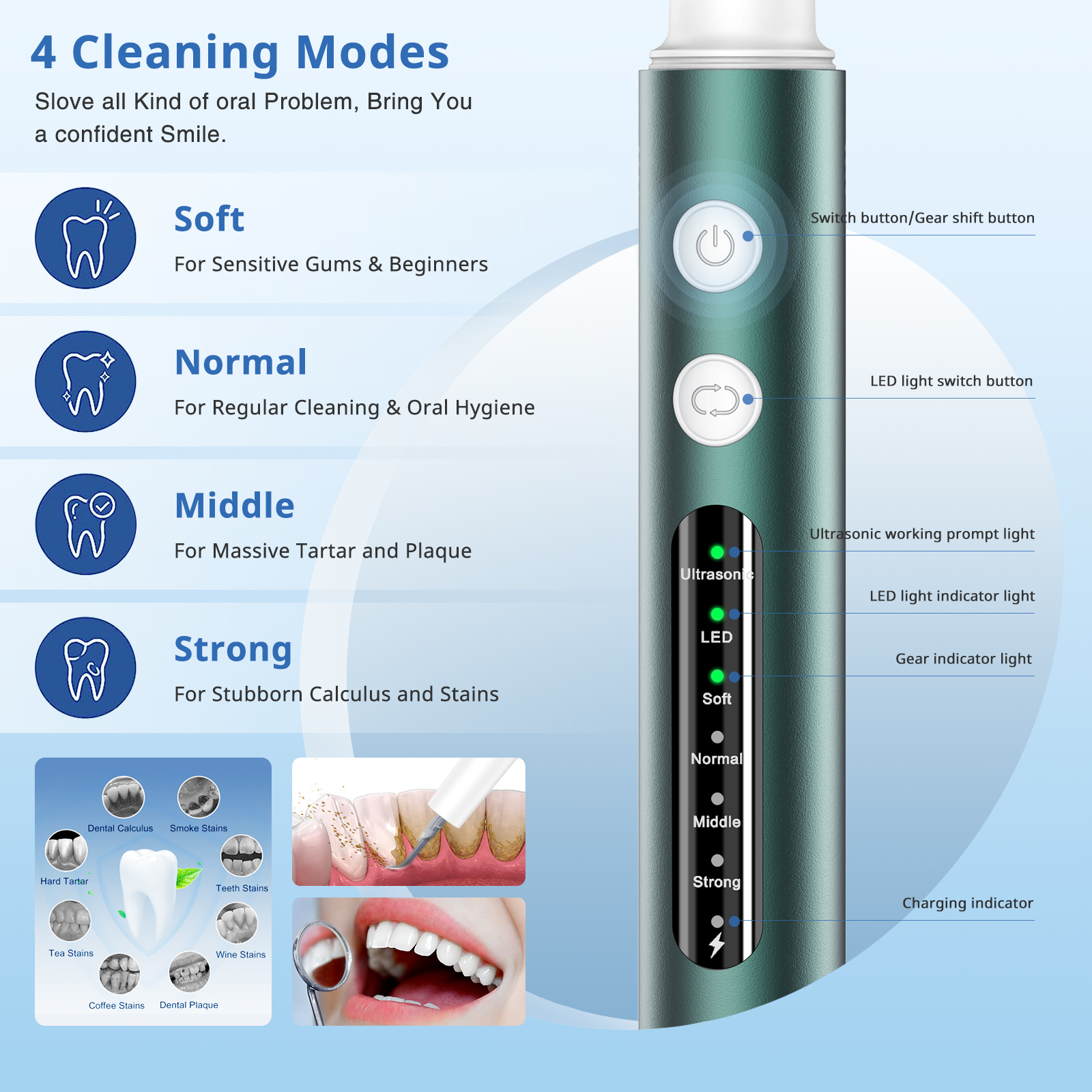 При касании твердых зубных отложений:начать работу; При касании мягкой десны: остановить работу.